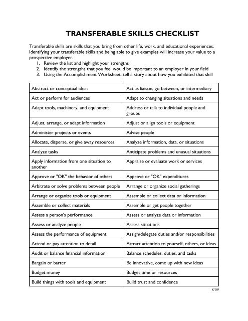 Transferable Skills Checklist Activity - Career Connections | Texas ... Over the years, you have developed many skills from coursework, co-curricular activities, and your total life experiences. If you have researched topics and written reports or edited and presented papers for classes, you have used skills that are not limited to just one discipline but are transferable to many different occupations or disciplines. Transferable Skills: What Are They? - The Balance Careers Transferable people skills include: Providing and accepting constructive criticism Motivating others Handling customer complaints Training new employees Delegating Counseling employees Building strong customer relationships Collaborating with others Mentoring less experienced colleagues Resolving conflicts between colleagues and/or customers