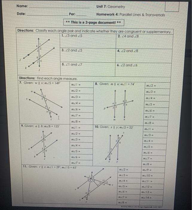 Parallel Lines And Transversals Worksheets - TheWorksheets.CoM ... A line that intersects two or more coplanar lines at two different points is called a transversal. In the diagram on the next page, line t is a transversal of lines q and r. Notice that line t forms a total of eight angles with lines q and r. These angles, and specific pairings of these angles, are given special names. Parallel Lines and Transversals Worksheet (PDF ... Parallel Lines and Transversals Worksheet (PDF) Identify each pair of angles as corresponding, alternate interior, alternate exterior, or consecutive interior. Find the value of angle A. ' Parallel Lines and Transversals Worksheet (PDF) Answer Consecutive interior Corresponding Alternate interior Alternate exterior Corresponding Answer: 100 degrees Parallel Lines And Transversals Worksheet Gina Wilson All Things ... Parallel Lines And Transversals Worksheet Gina Wilson All Things Algebra. Parallel lines cut by a transversal coloring activitythis is a fun way for students to practice solving problems related to parallel lines cut. Slope of ab slope of cd types of lines gina wilson (all things algebra, 2014.