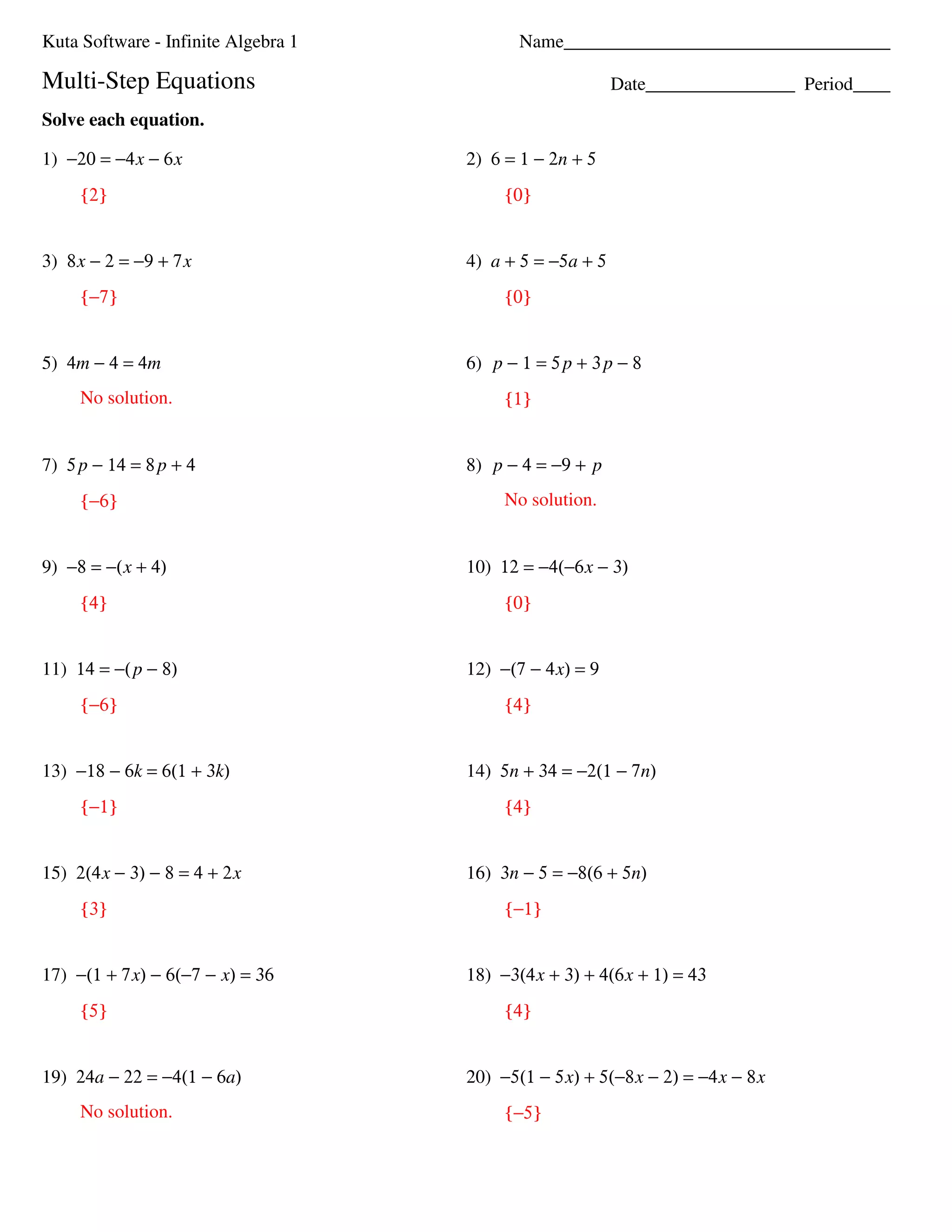 cdn.kutasoftware.com › Worksheets › Alg1Multi-Step Equations Date Period - Kuta Software ©4 f2Z0 T1q2 v 3K xuOt7a B zScomfQtKw6a0r2e x HLuL 8Cm. G 9 fA Xlfl W tr Vi XgVht2s W zr 6eGsweHrHvFevdV.e a fM 5a jd yex Qw BiOtRhE QI2n 3fFi ln xictfe h PA Tl gbeub tr da i q1 e.Y Worksheet by Kuta Software LLC Kuta Software - Infinite Algebra 1 Name_____ Multi-Step Equations Date_____ Period____