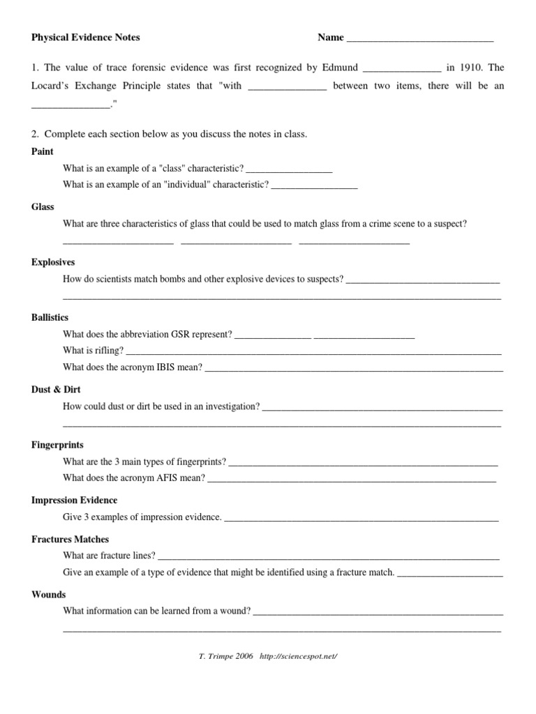 Crime Scene Basics Worksheet Answer Key - sfldefenders.org Crime Scene Basics Worksheet Answer Key Tant it is to secure a crime scene Key forensic evidence can be lost. Deregulation On Twitter Worksheet created by T Trimpe 2003 httpsciencespotnet Scientific Method Name. The physical evidence left behind at a crime scene to help determine the identities. Unit analysis worksheet 1 answer key. Forensics Crime Scene Basics Flashcards | Quizlet May prove that a crime has been committed Establishes key elements of a crime Link a suspect with a crime scene or a victim Establish the identity of a victim or suspect Corroborate verbal witness testimony Exonerate the innocent Give detectives leads to work with in the case Police Officers Are typically the first to arrive at a crime scene.