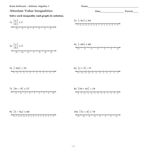 Absolute value inequalities worksheet. Intro to absolute value inequalities (video) | Khan Academy To solve inequalities with absolute values, use a number line to see how far the absolute value is from zero. Split into two cases: when it is positive or negative. Solve each case with algebra. The answer is both cases together, in intervals or words. Absolute value equations - Math Worksheet This free worksheet contains 10 assignments each with 24 questions with answers. Example of one question: ... Absolute value inequalities Graphing Single Variable Inequalities Radical Expressions Adding and subtracting Dividing Equations Multiplying Simplifying single radicals Absolute Value Inequalities.ks-ia1 - Kuta Software ©A i2x0 v1L2H MKGuHt AaO lS ro kfAtXwBa r4e1 hL gL3C4. h b qA3l qlc yr WidgMhLtXs8 Lr Me1s9eArnvve CdR.C E KMJaKdYej xw AiotVhy lIan 0fXiln4i gt3eC cA Pl 0g9e 0bSr uai F1f. f Worksheet by Kuta Software LLC Kuta Software - Infinite Algebra 1 Name_____ Absolute Value Inequalities Date_____ Period____ How to solve absolute value inequalities. Step by step interactive ... In the picture below, you can see generalized example of absolute value equation and also the topic of this web page: absolute value inequalities . Example 1. The diagram below illustrated the difference between an absolute value equation and two absolute value inequalities .