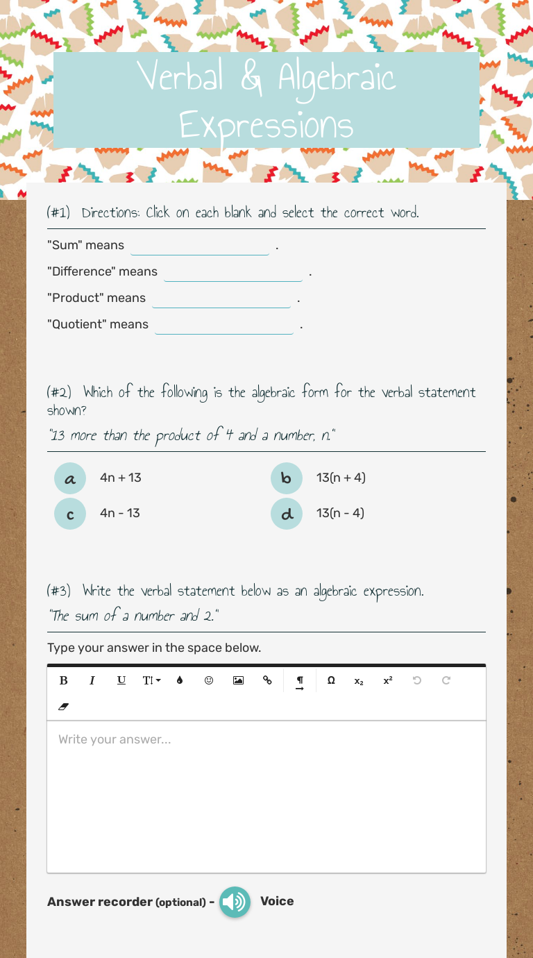 Write an algebraic expression for each verbal expression. the ... Write an algebraic expression for each verbal expression. the difference between twice a number and 8Watch the full video at: ... verbal expressions and algebraic expressions - TeachersPayTeachers This fun coloring sheet has 20 verbal phrases to match with algebraic expressions. Your students will love practicing their algebra skills in anticipation to coloring the cool picture. Unlike many matching activities, students will be challenged with these expressions because they all contain only the numbers 2, 6 and the variable n. Writing expressions with variables (practice) | Khan Academy Learn for free about math, art, computer programming, economics, physics, chemistry, biology, medicine, finance, history, and more. Khan Academy is a nonprofit with the mission of providing a free, world-class education for anyone, anywhere. Prove the identity solver - softmath Teaching samples for algebraic expression equations at the gr. 8 level ; ways to learn algebra ; Least common multiple worksheets ; dividing fractions worksheet "square root method" free accounting math practice test "graphing tutor" simpifying radicals calculator ; math worksheets add, subtract, multiply, and divide integers