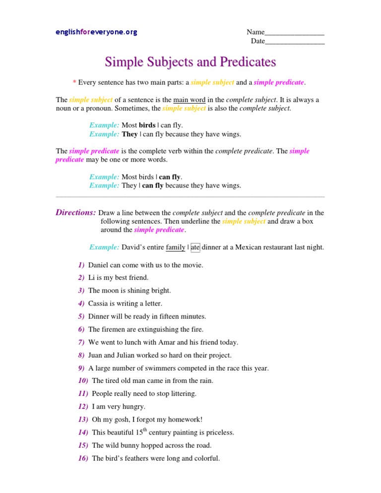 Subjects, Predicates, and Objects | Language Arts Activities Subjects, Predicates, and Objects Worksheet Here is a simple worksheet to help students review subjects, predicats, and objects. Students read thirty sentences and identify the parts of each. Then they write original sentences and identify their own uses of subjects, predicates, and objects. Subjects, Predicates, and Objects Worksheet Links Preview PDF Complete Subjects and Predicates - EnglishForEveryone.org The complete subject includes all words that tell who or what the subject is. Example: Most birds | can fly. The complete predicate includes all words that state the action or condition of the subject. Example: Most birds | can fly. _____ Directions: Draw a line between the complete subject and the complete predicate in the following sentences.